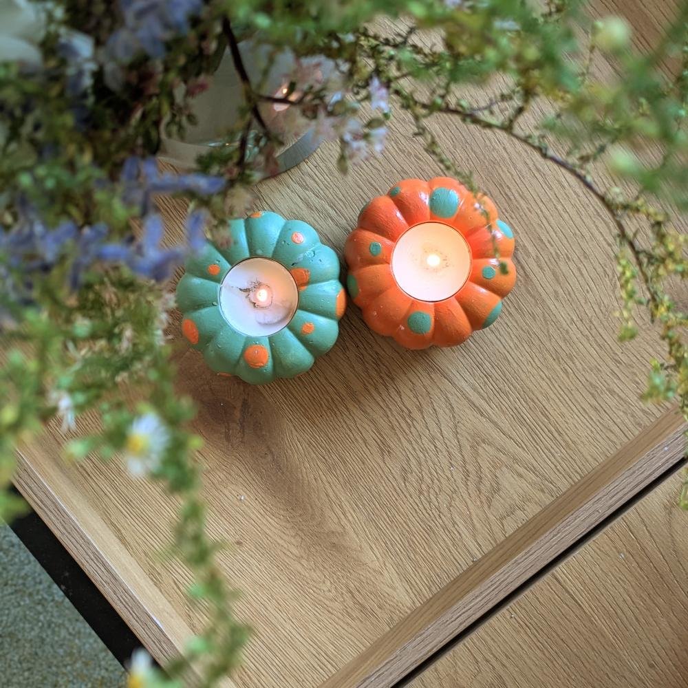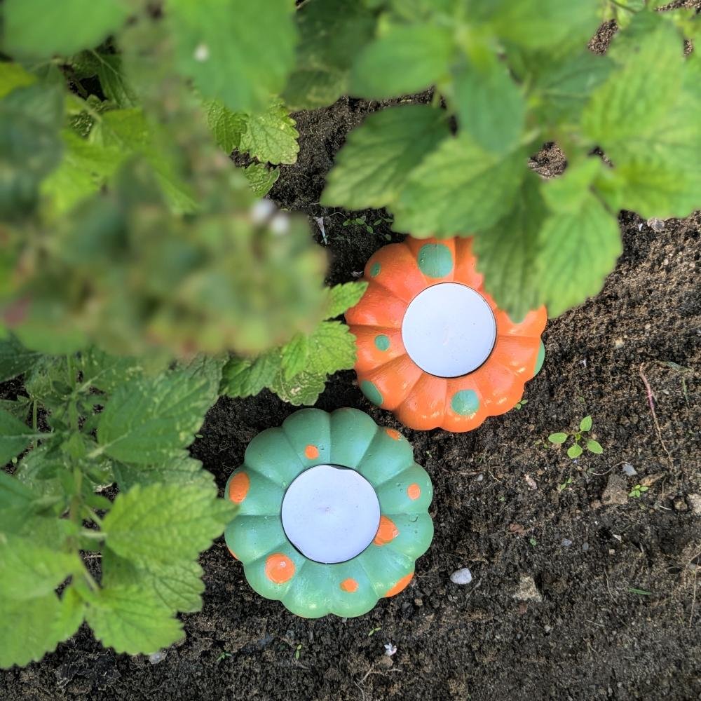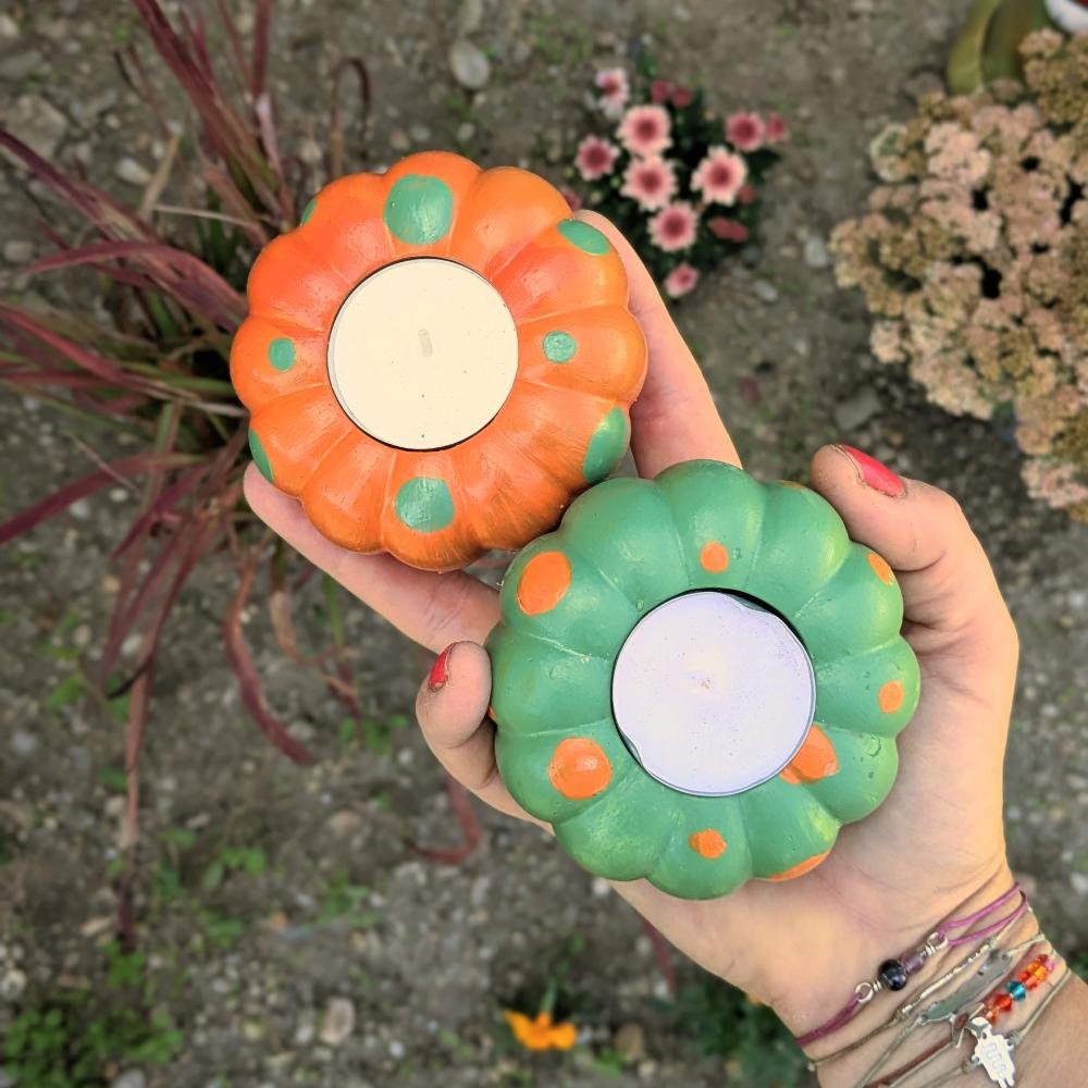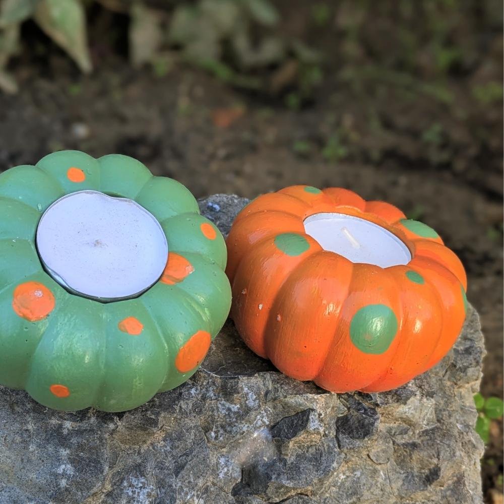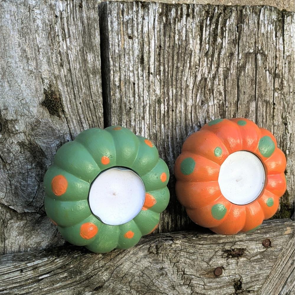 Két darab betonból készült, festett tök formájú mécsestartó, amivel szöget is be tudsz verni. Az alján karcgátló található.