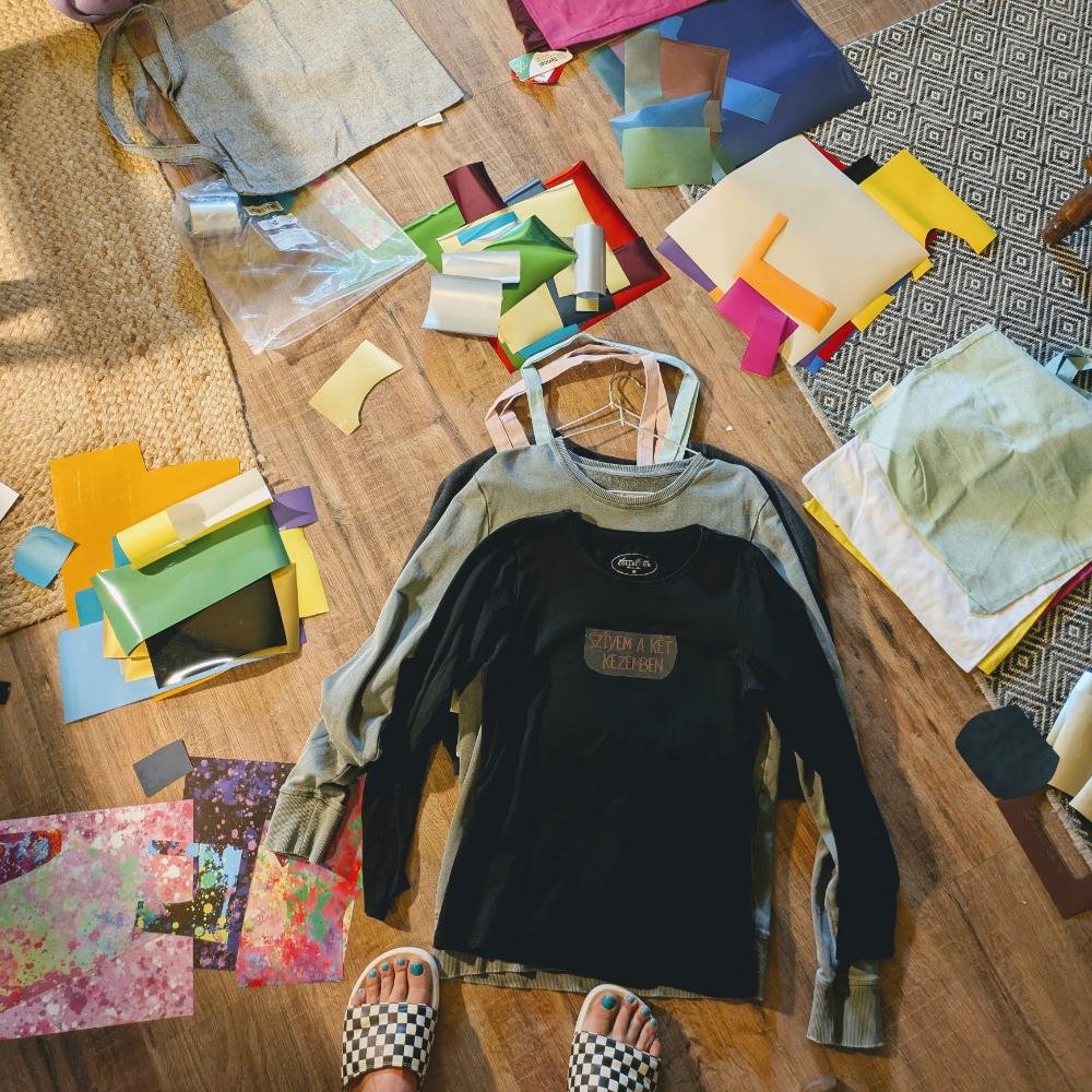 Én előtte hetekig járom a lomit, hogy csoda darabokat szerezzek Nektek, magunknak. Ezeket kimosom, javítom, majd elviszem magammal a workshopra, ahol mindenki tud választani. Ezeket a ruhákat strasszokkal fóliával festékekkel díszítjük, hőprésezzük, majd iszonyatosan imádjuk! <3